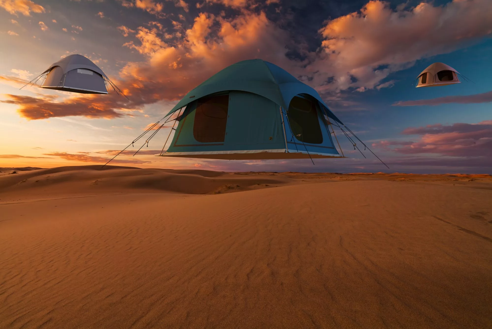 Atelier KG leverde ons nadien ook achtergronden aan met werelden waarin ze de tenten wilden laten zweven. We compositen onze tenten in deze achtergronden zodat het voor de kijker leek alsof ze echt in deze omgeving zweefden.