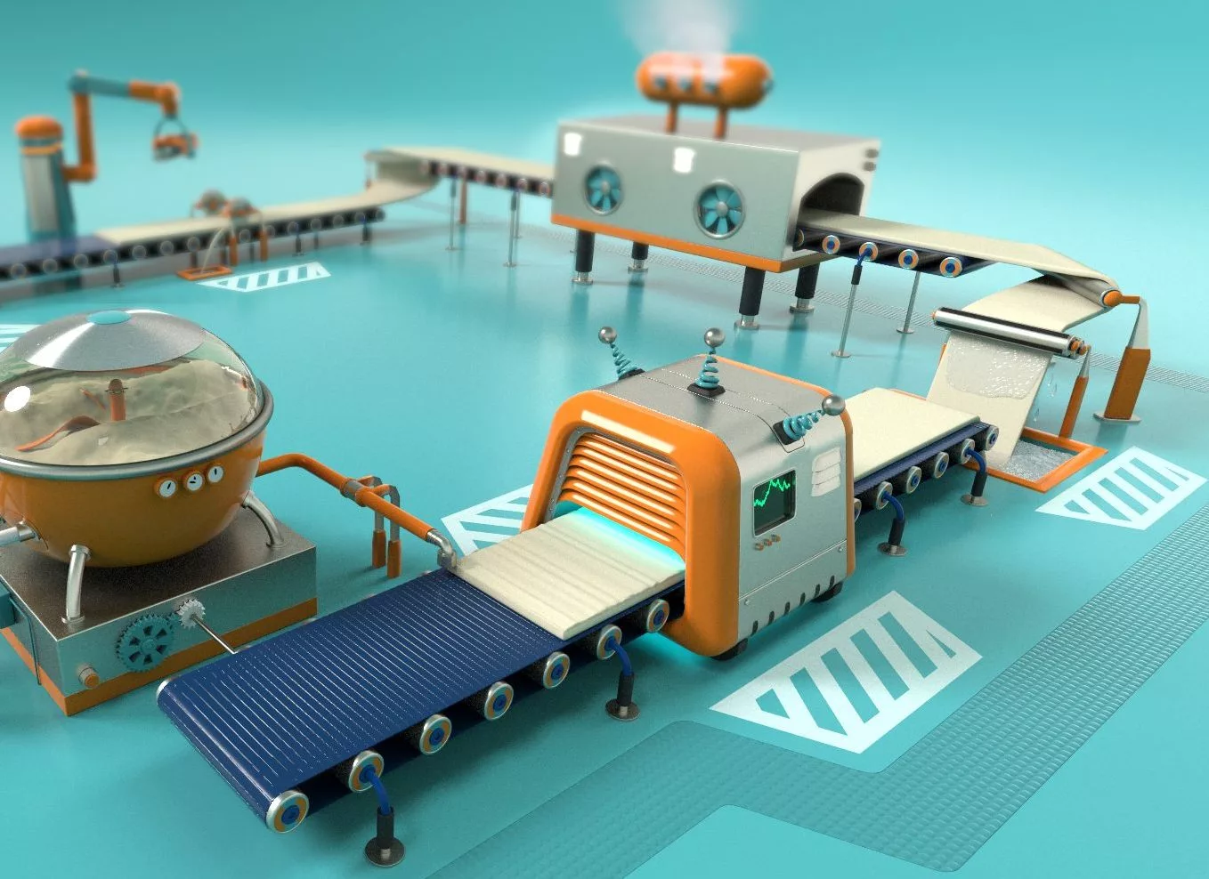 De magic van deze kwalitatieve latexproductielijn gebeurt in de hoge frequentieoven. Dat is moeilijk in beeld te brengen met een gewone audiovisuele productie. Bovendien zijn zo’n machines zelf ook niet meteen een streling voor het oog. We stelden voor om abstractie te maken van het proces én de machines en dit op een eigentijdse, aantrekkelijke, behapbare en duidelijke manier voor te stellen.
