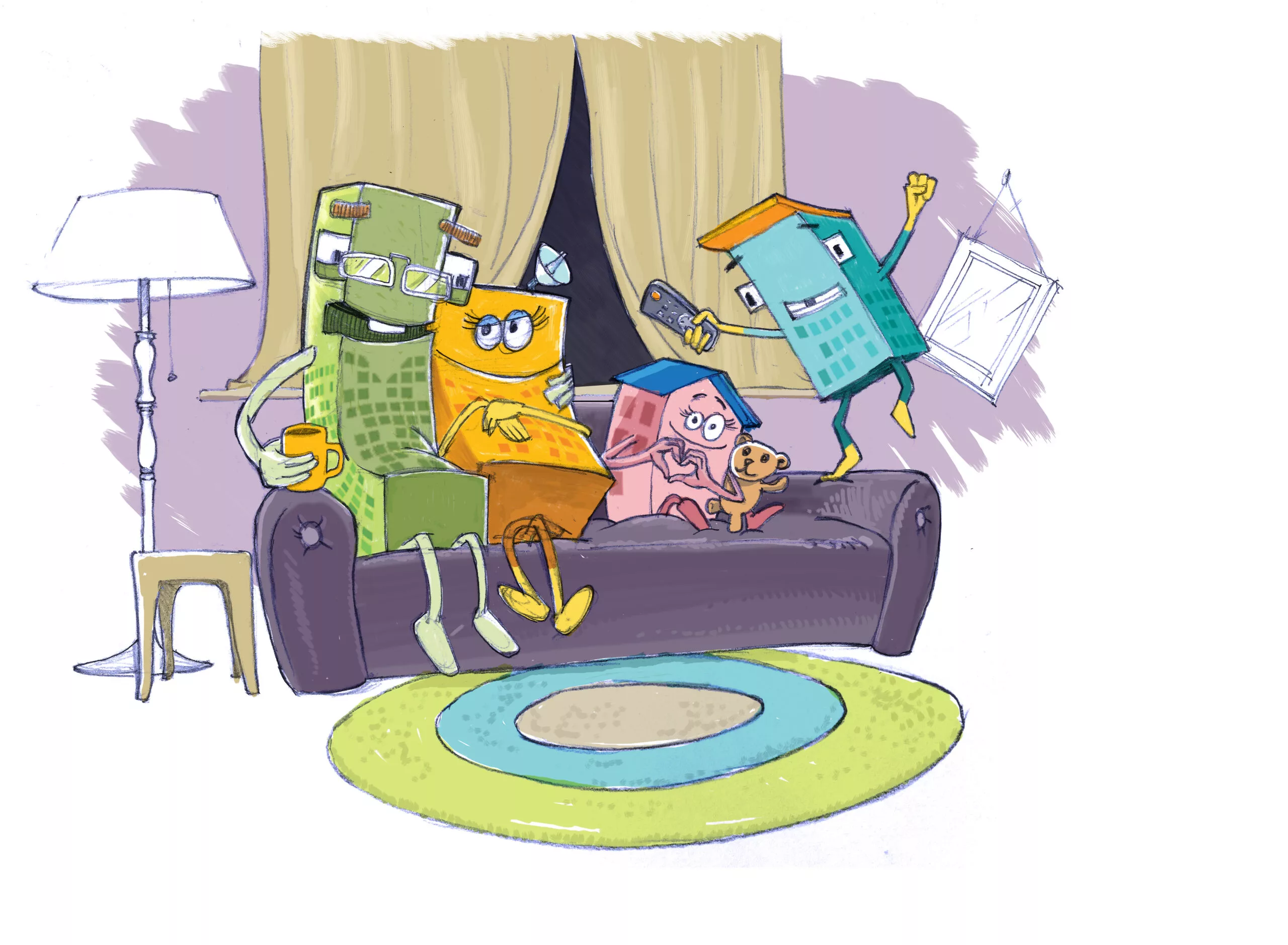 Rekening houdend met de strakke timing (WoninGent wilde de karakters immers lanceren op de dag van de medewerker 1 maand later) en de budgettaire mogelijkheden werd gezocht naar een stijl en een basis setup om de mascottes een eerste keer samen te introduceren. We ontwikkelden deze keyvisual: